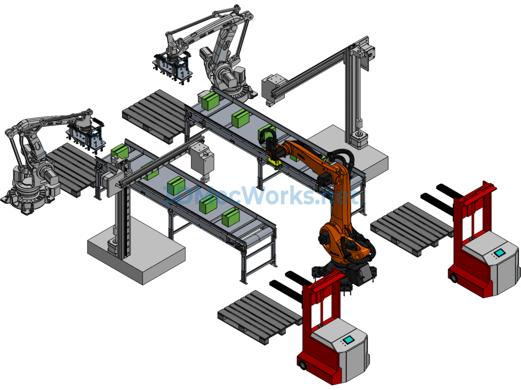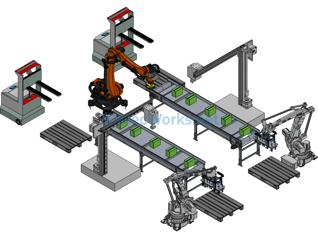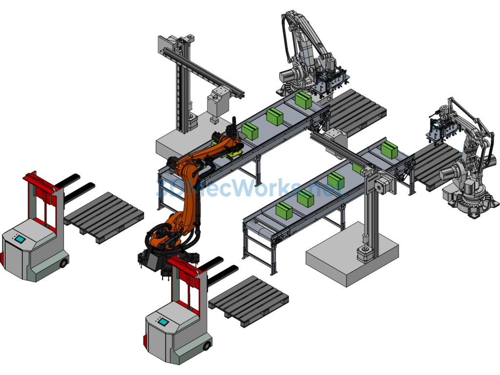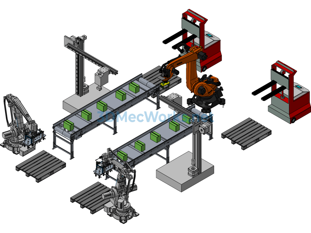 Carton Surface Laser Coding Automation Production Line: This uploaded model is an online automated coding production line that performs laser coding on the surface of packaged cartons to facilitate subsequent tracking of product information. Materials are loaded and unloaded by robots, with laser printing units designed on both sides of the conveyor line. As products pass through, they are quickly coded, then transported forward upon completion. The upload format is XT. Welcome to download.