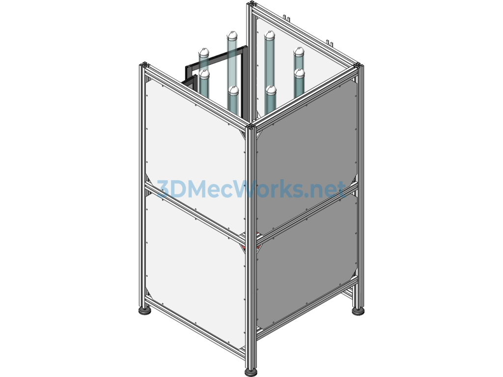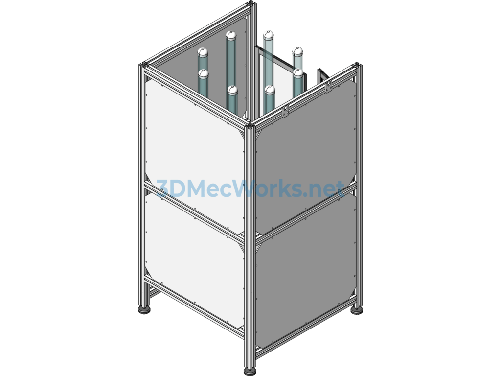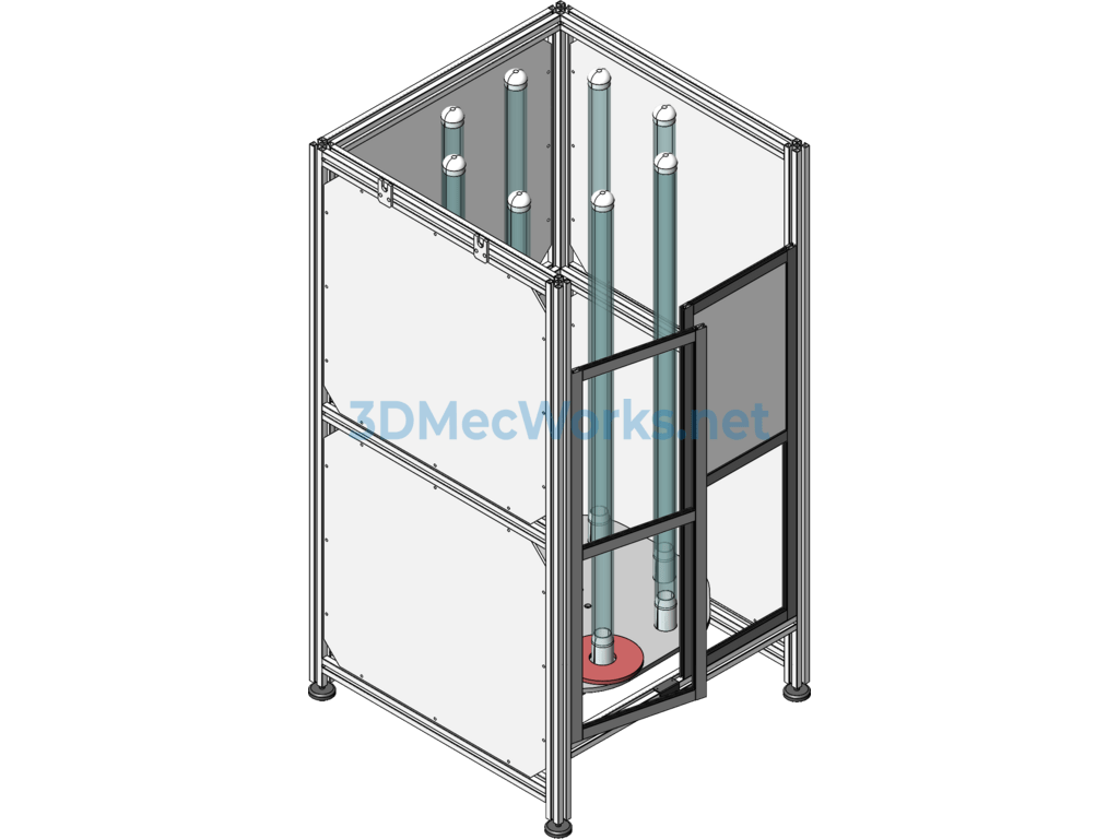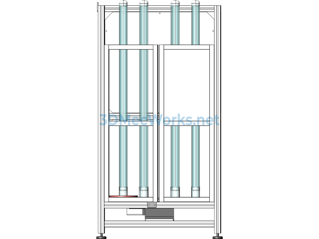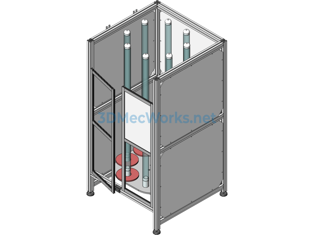 An automatic rear wheel cover stacking device, primarily used for discharging injection-molded products. The mechanism mainly consists of a servo motor driving a divider to perform receiving actions at eight stations. It features an aluminum profile frame and includes engineering drawings and equipment operation videos.