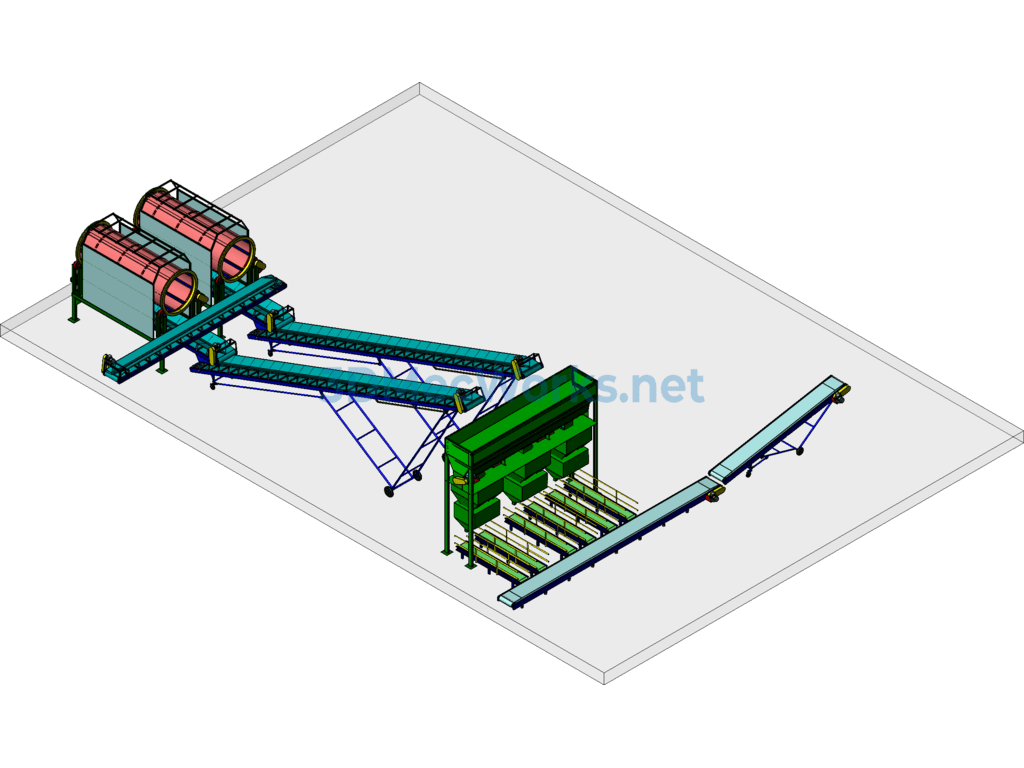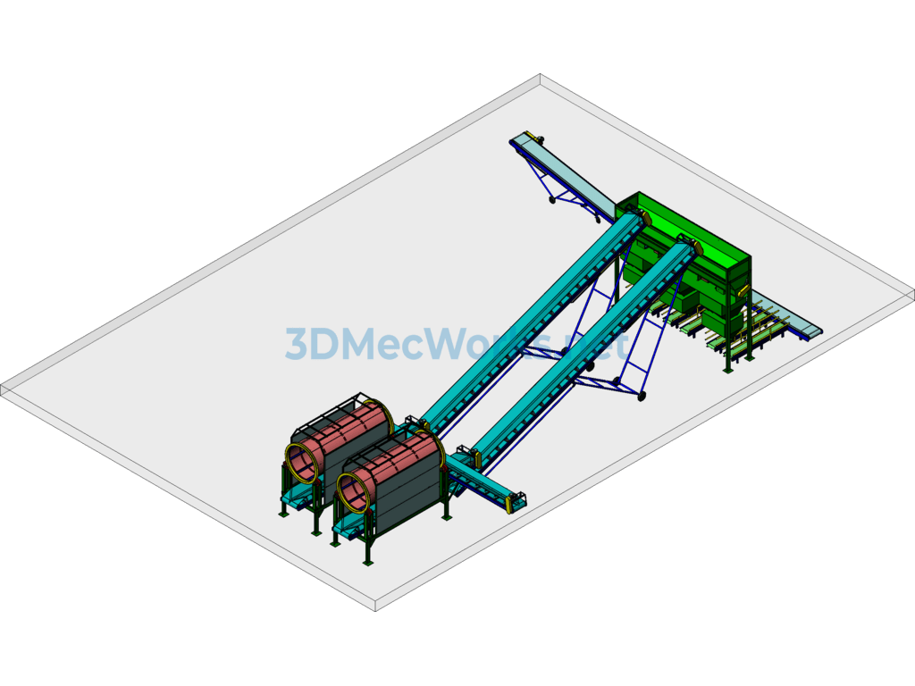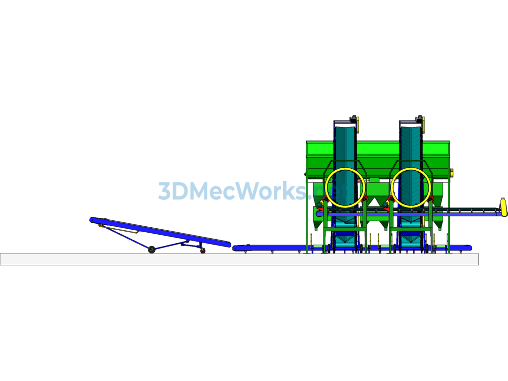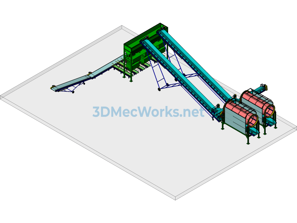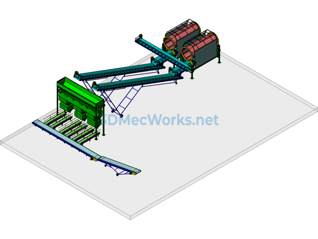 Concrete Mixing Conveyor. This model is created using SolidWorks 2015 and includes parameters that can be edited. This conveyor is used in large concrete plants to mix and blend aggregates. It rotates the aggregates via a drum conveyor, transports them to a belt conveyor, and then uses an inclined belt conveyor to move them into a spiral mixing box for further mixing. Finally, the mixture is conveyed out of the silo via a belt conveyor. Feel free to download and study if interested.