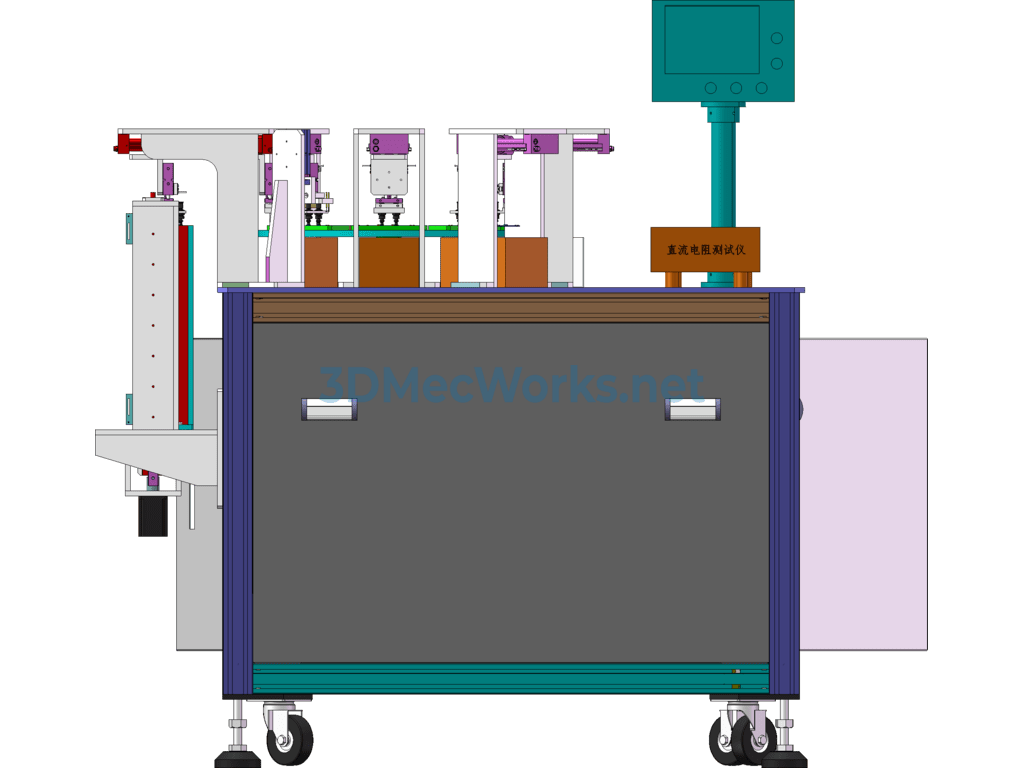 Automatic loading of copper pieces, sequentially test their resistance values for classification.