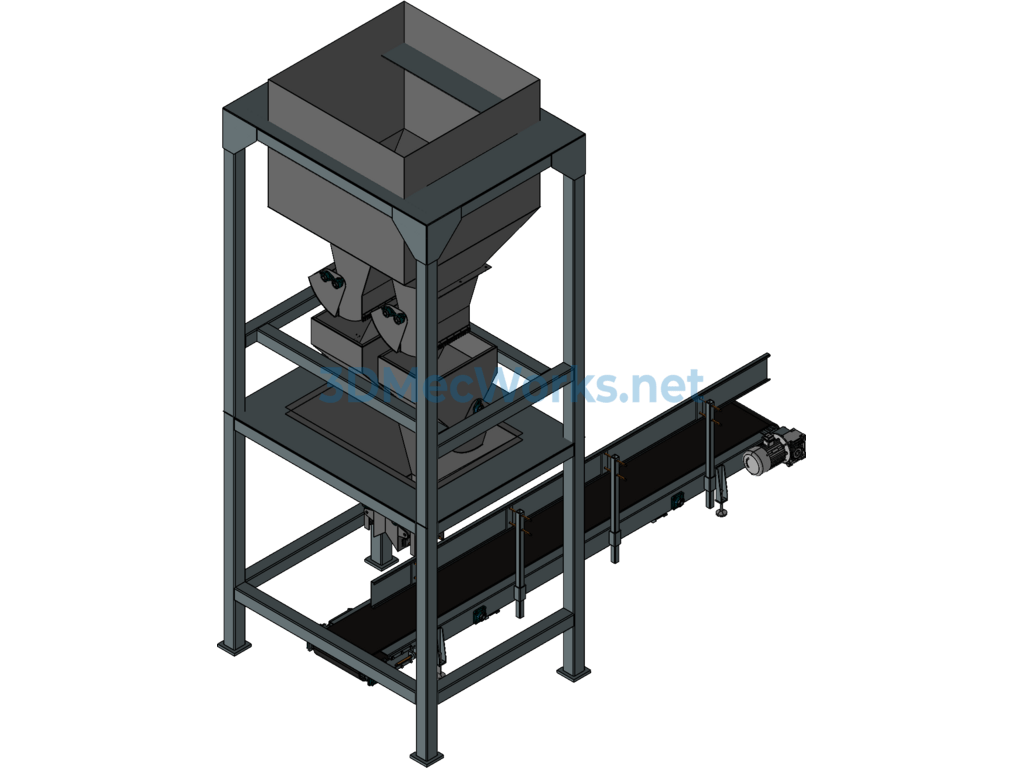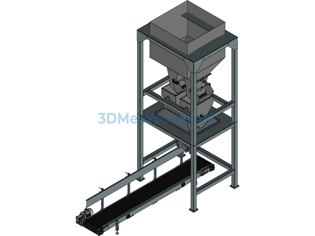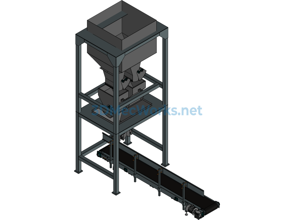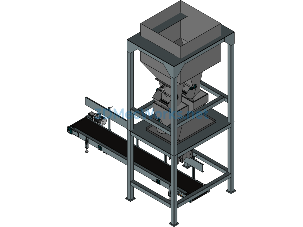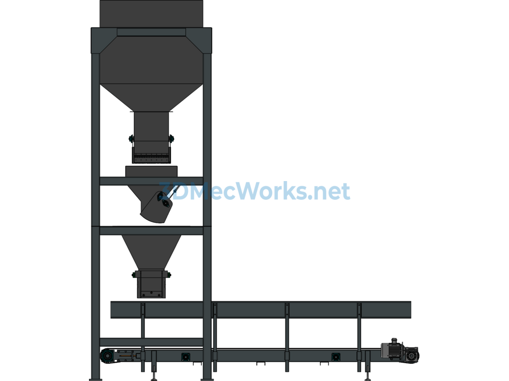 Design of Automated Feed Bagging Equipment: Once the feed is produced, it needs to be bagged. This equipment serves as a quantitative bagging machine. An automated opening mechanism is designed below the funnel, allowing for precise control of the material discharge. A lower conveyor line transports the bagged products forward. The model is available in XT format. Feel free to download.