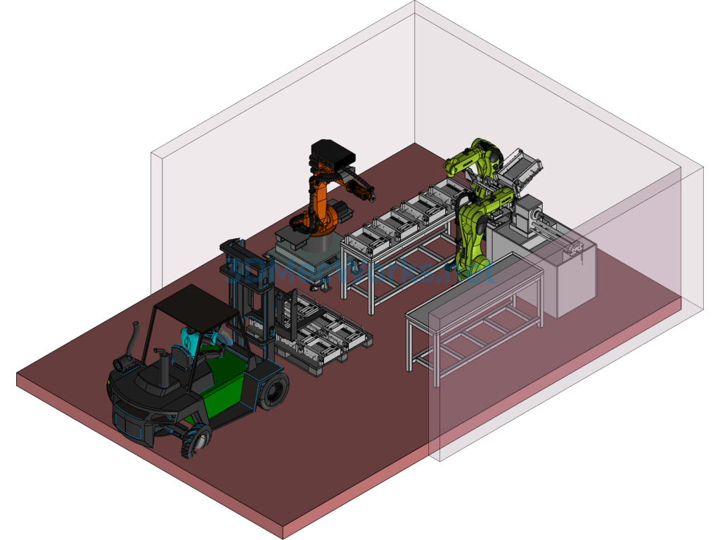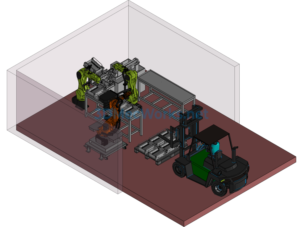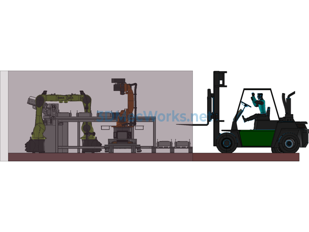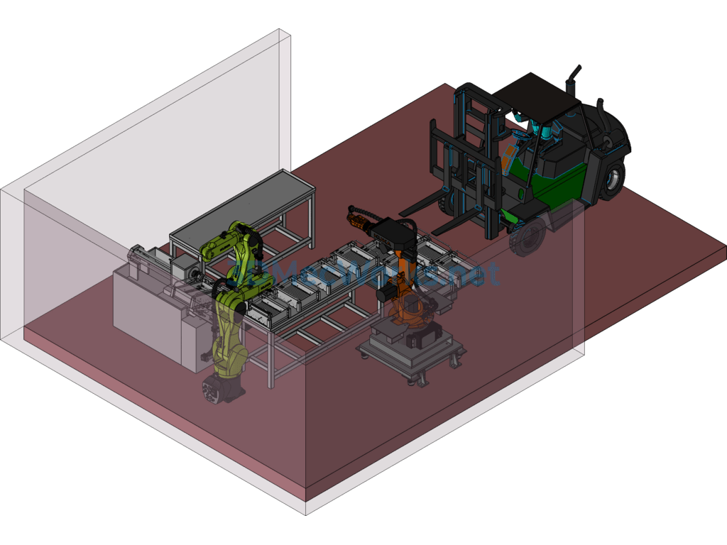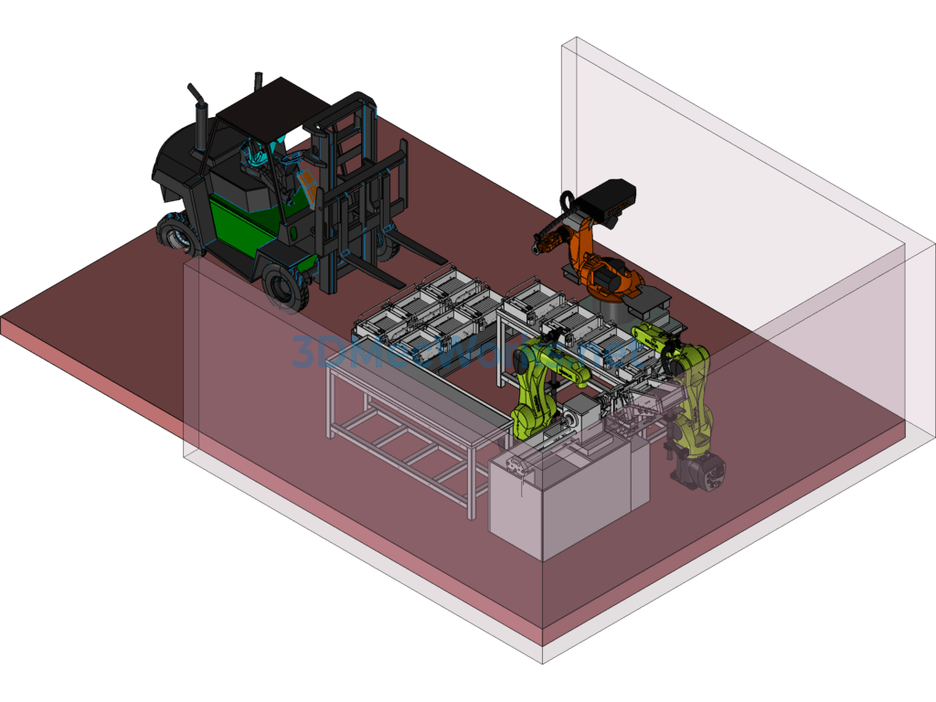 This production line is a machining diagram for threading circular shafts. The circular shafts are conveyed to the processing position by automated material arrangement and feeding mechanisms. After processing, they are boxed and palletized by a robot. Once completed, a forklift transports them to a designated area. The upload format is XT.