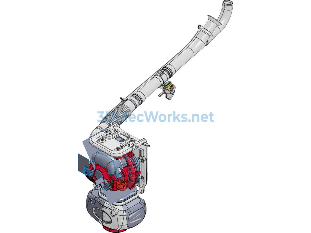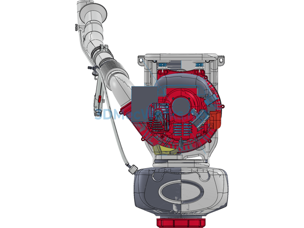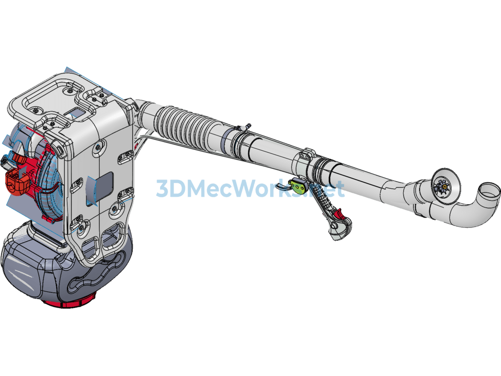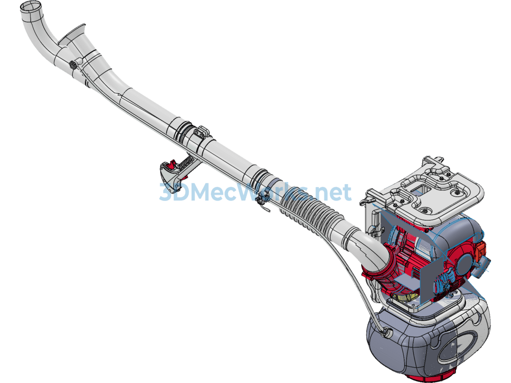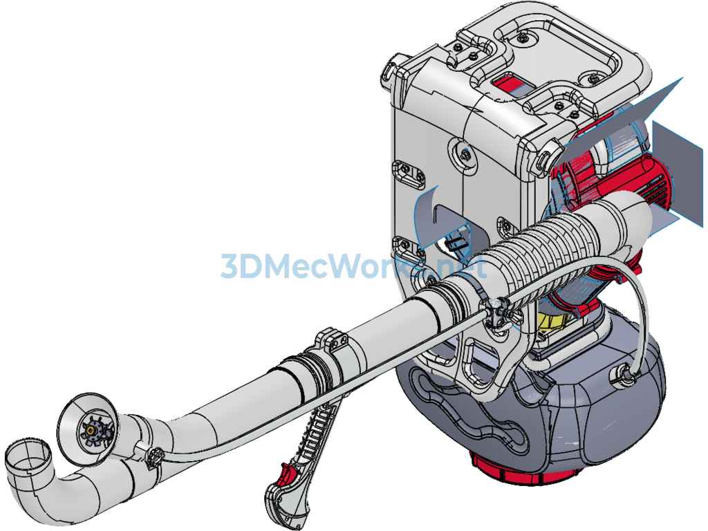 This product is a sprayer 3D model powered by a gasoline engine motor, available in ProE design source files. It includes the internal structure of the motor, the appearance and structure of the handle, the oil pot, and the structural and design elements of all components. It fully illustrates the reasonable arrangement and fitting of internal components, as well as detailed local mechanism links.