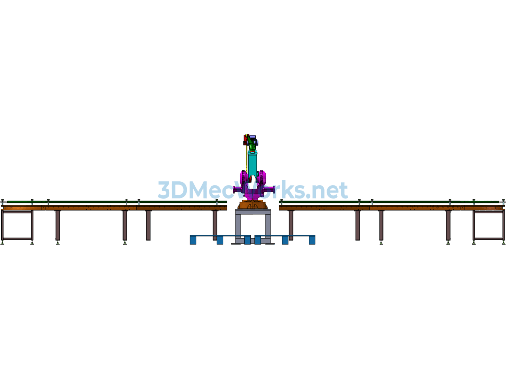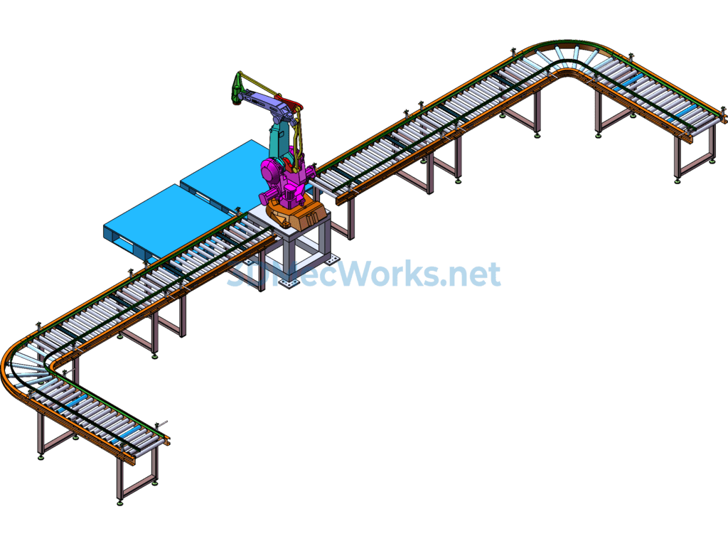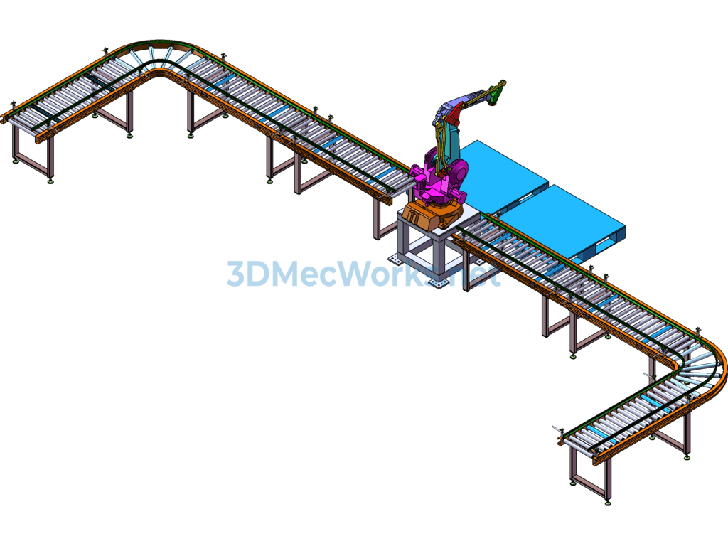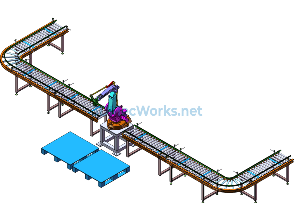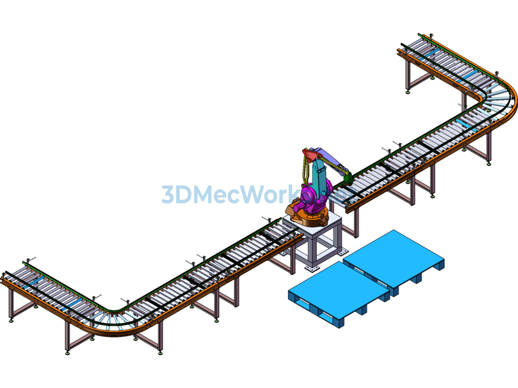 Product roller conveyor line, suitable for transporting large-sized goods. The guide plate can be adjusted according to the product size. The motor is selected based on the weight of the transported goods. The rollers are driven by a chain, and each roller can function as an independent unit. The overall structure can be modified according to actual needs.