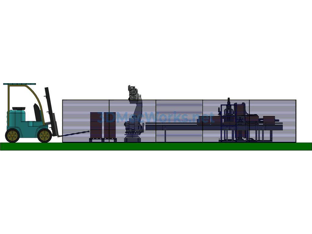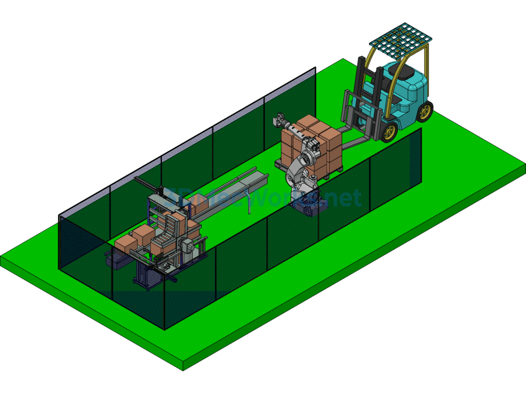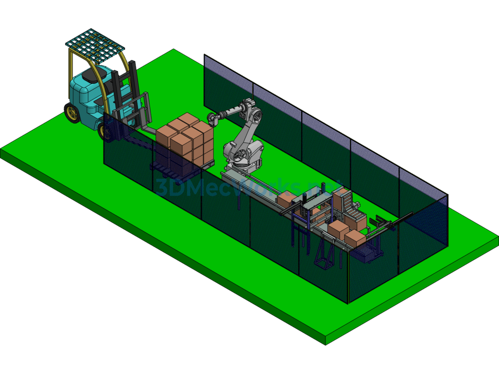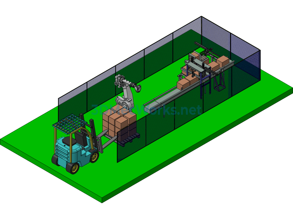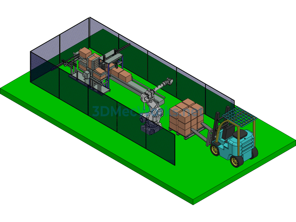 Robot Palletizing Automation Design: This uploaded model is for robotic automated palletizing. The robot stacks boxes from the conveyor line onto a pallet, and a forklift transports the palletized products to a designated workstation. Format: X-T. Welcome to download and refer to the design.