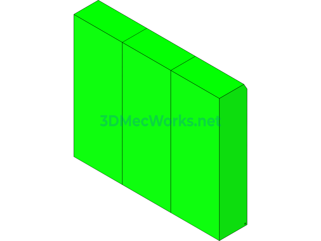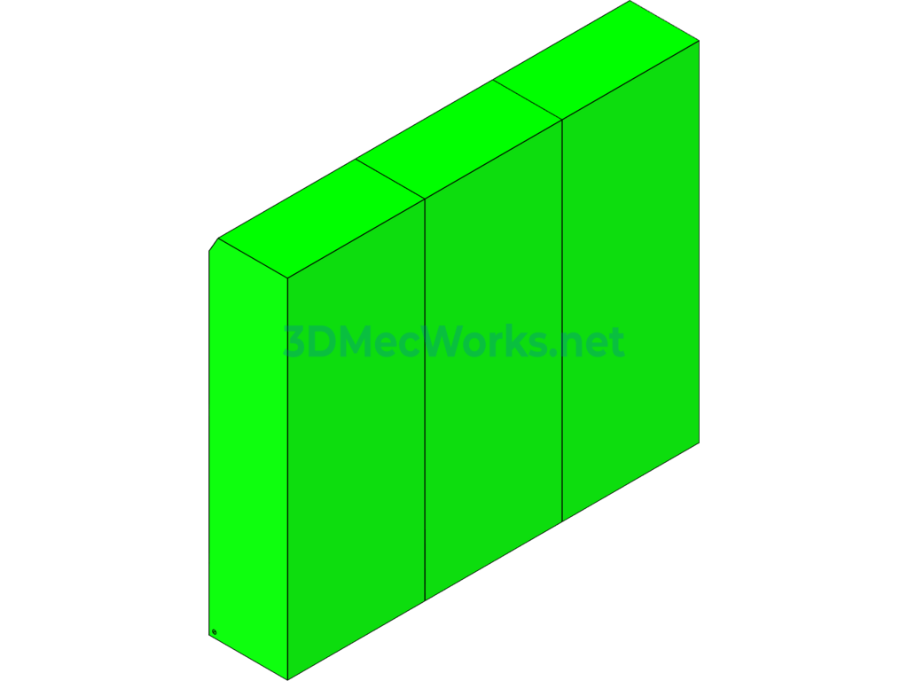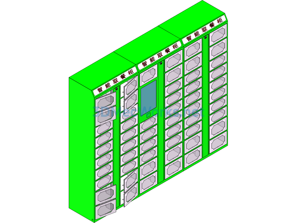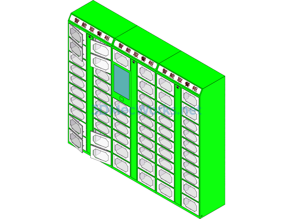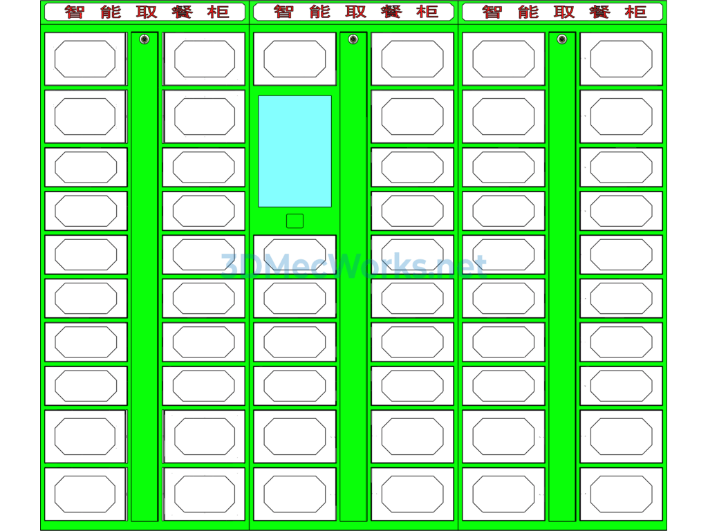 Self-Service Meal Cabinet, Sheet Metal Model Diagram. The material can be cold-rolled steel 1020, with a painted surface. The self-service meal cabinet is divided into a main unit and an auxiliary unit. The main unit is designed with 17 compartments: 7 large compartments and 10 small compartments. The auxiliary unit is designed with 20 compartments. Each compartment is equipped with UV light for disinfection and temperature maintenance functions.