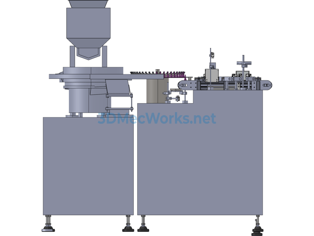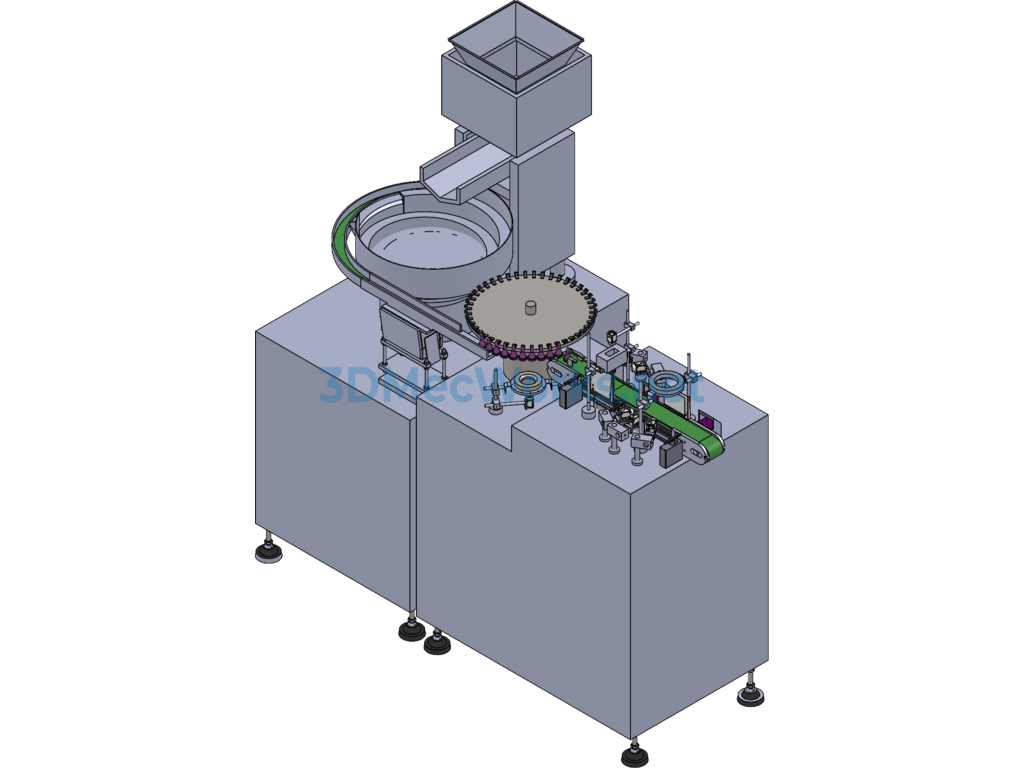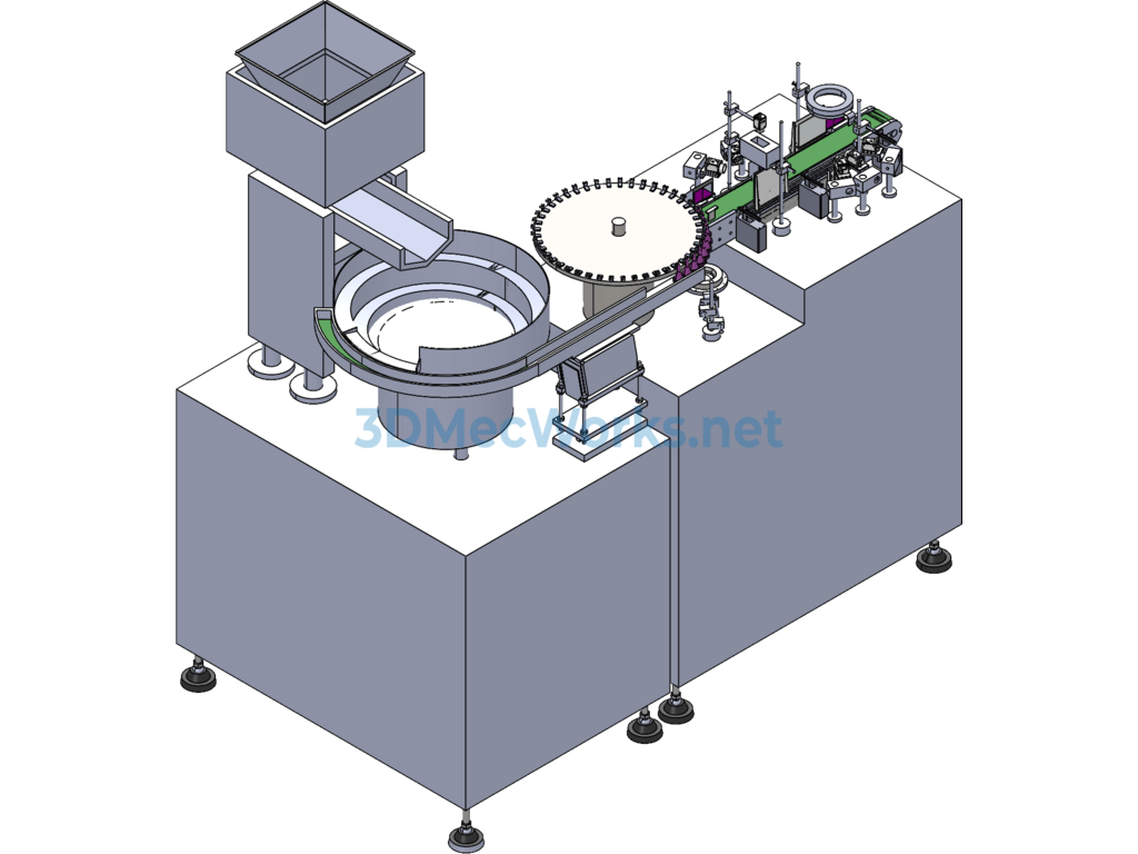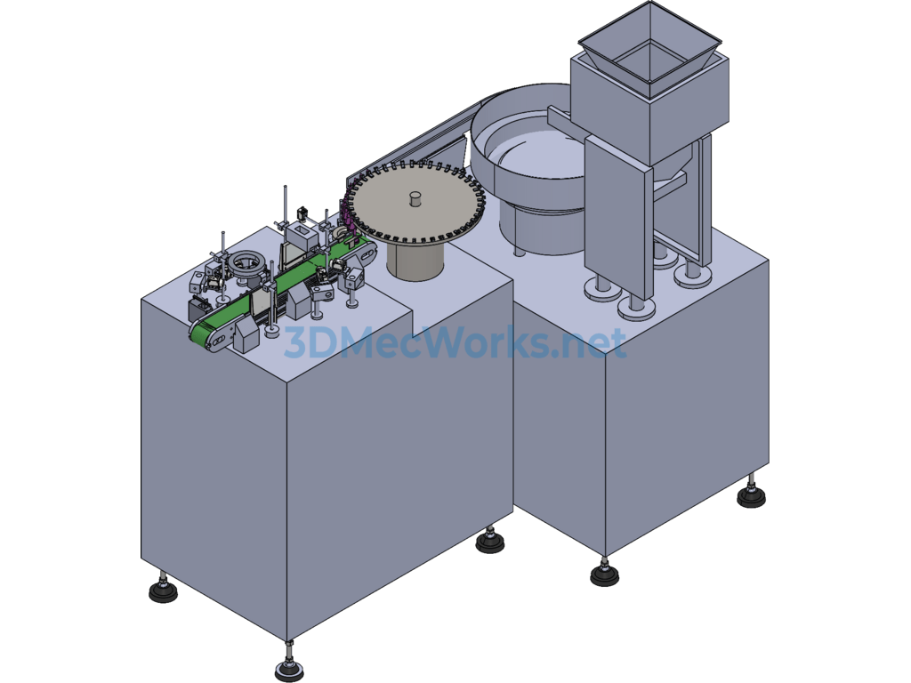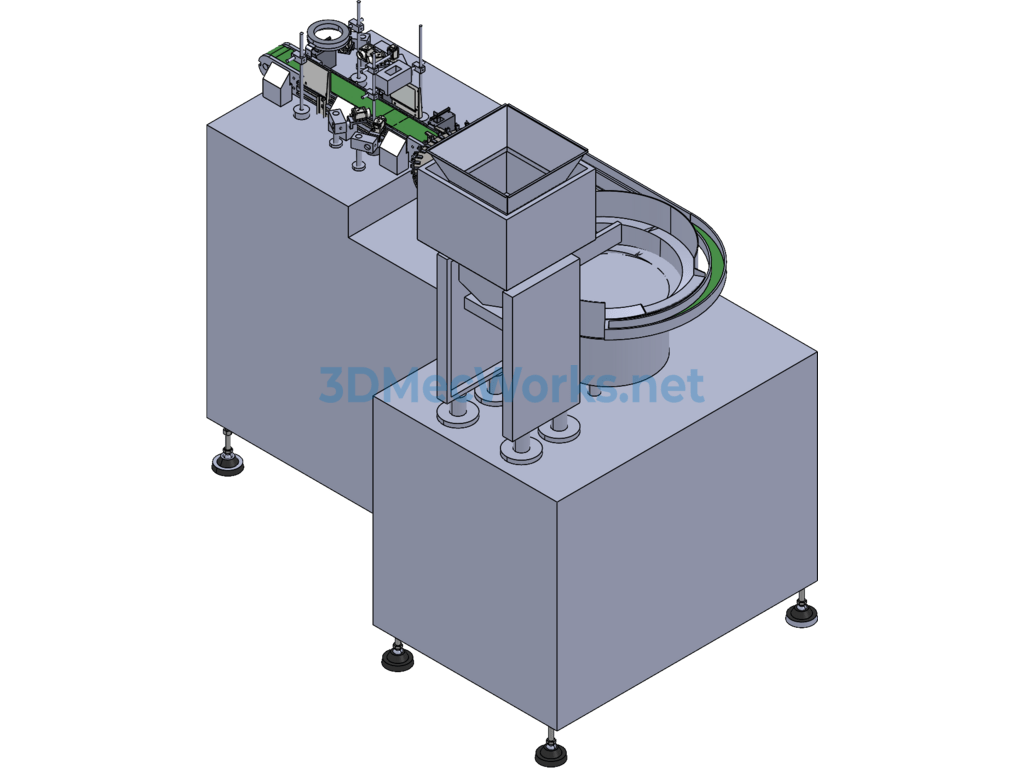 Vision inspection equipment, as the name suggests: vision inspection workpiece equipment, is a non-standard device based on vision inspection. It consists of an elevator, vibrating plate, suction device, synchronous belt, and camera. The 3D model Sldprt file is provided and is non-parametric, hence not editable.